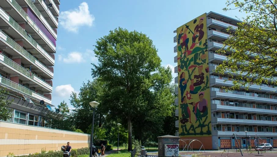 Adorning the walls of colossal apartment blocks, alleyways and residential complexes, Zuidoost is teeming with beautiful street art. To see it all, we’d recommend hopping off the metro at Bullewijk to explore the H-neighbourhood. First, check out the vibrant mural at the intersection of Heesterveld and Hakvoort - you can’t miss it. Continue to the Hakfort flat, where Egyptian artist Ammar Abo Bakr painted the side in splashing colours. You can then head through the abstract Haagse Huis passage toward Nelson Mandela Park to spot a kaleidoscopic mural by Ramon Martins.