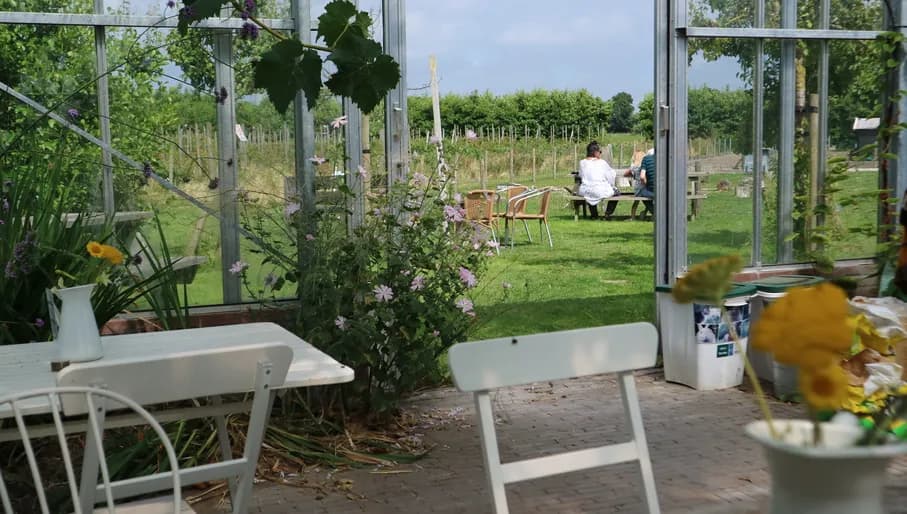 Hier wandel je zo de tuin in, waar je tussen de rijen seizoensgroenten oogst wat er die week rijp is: van sla en paksoi tot bonen, bieten en courgettes. Tussen de groenten groeien ook kruiden en eetbare bloemen en in de bloementuin pluk je je eigen boeket.