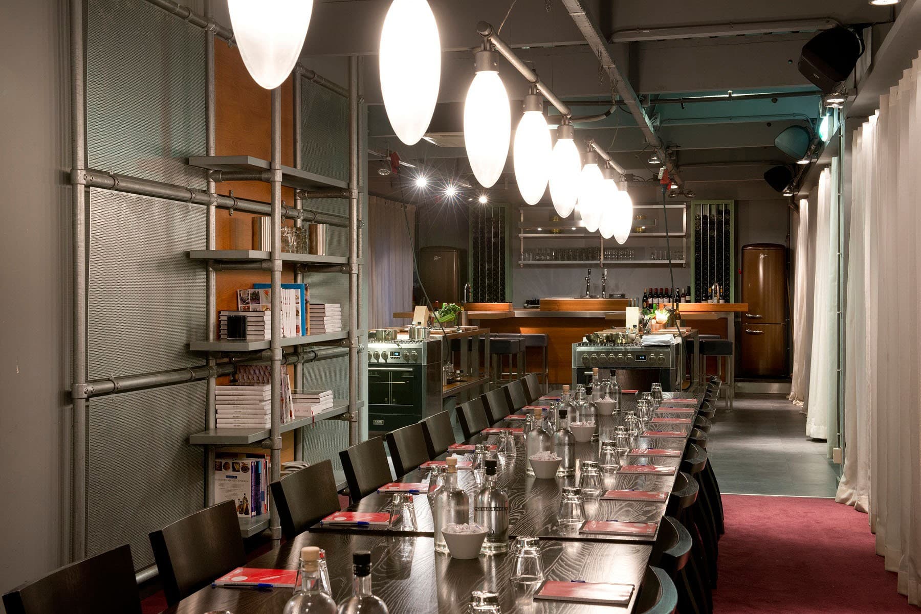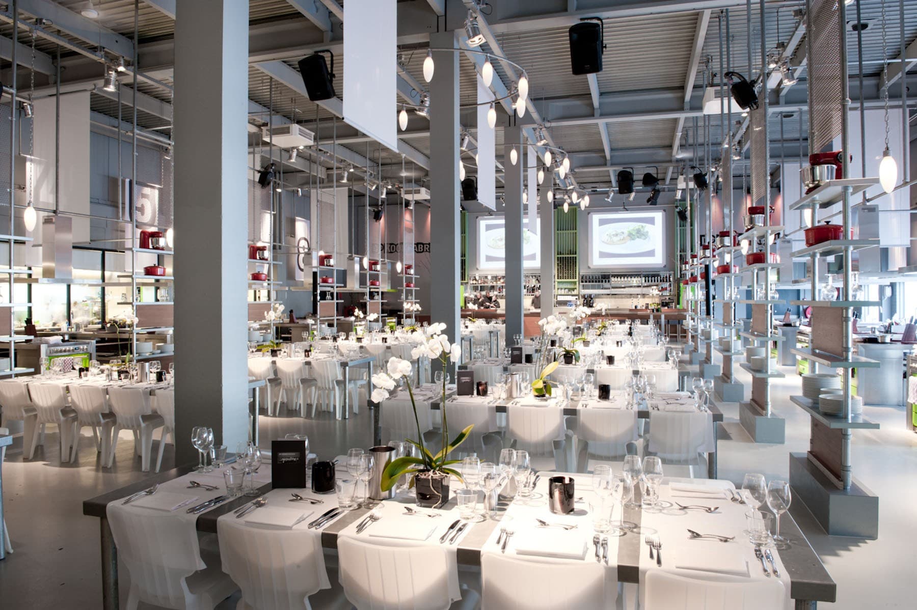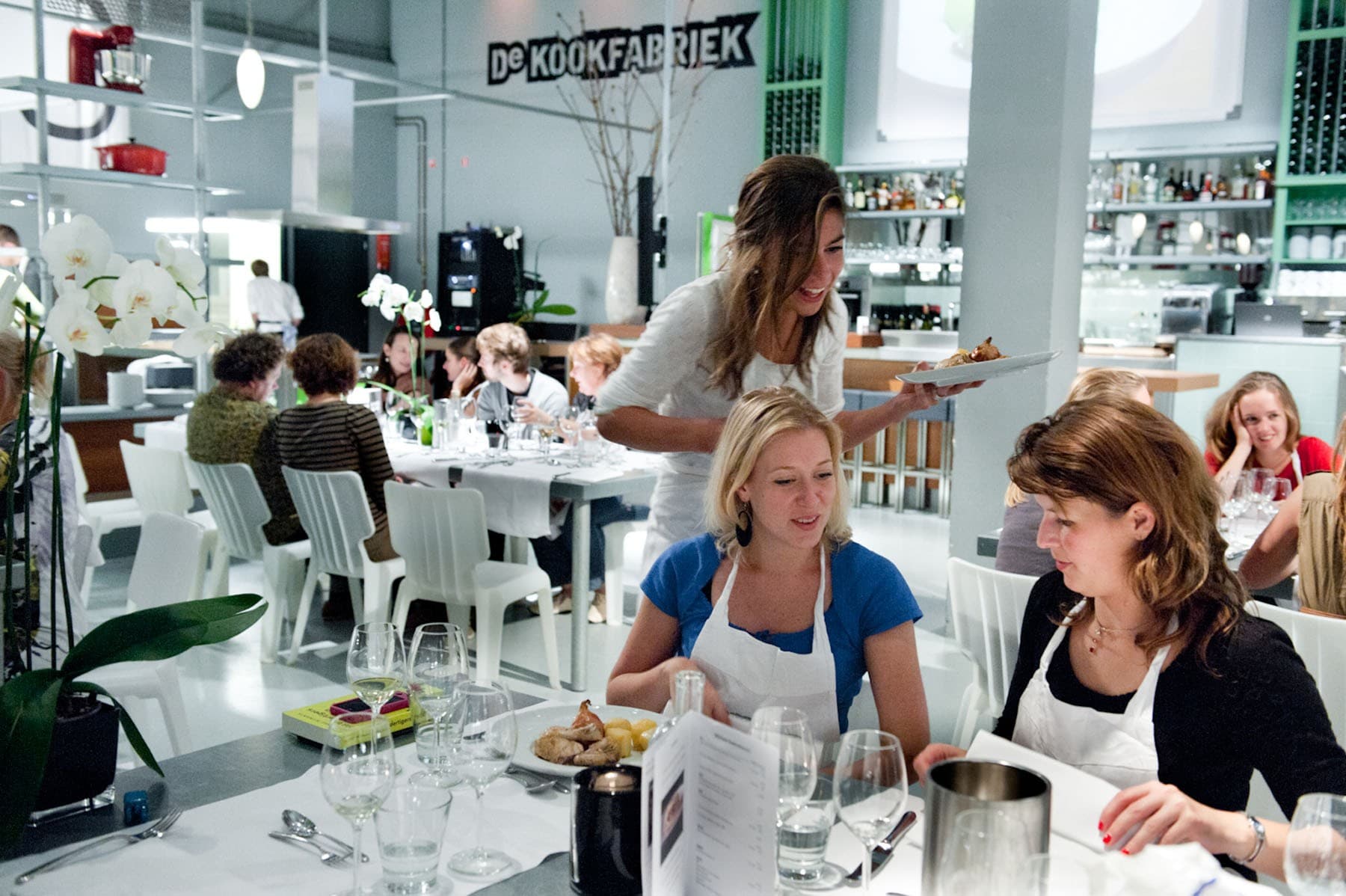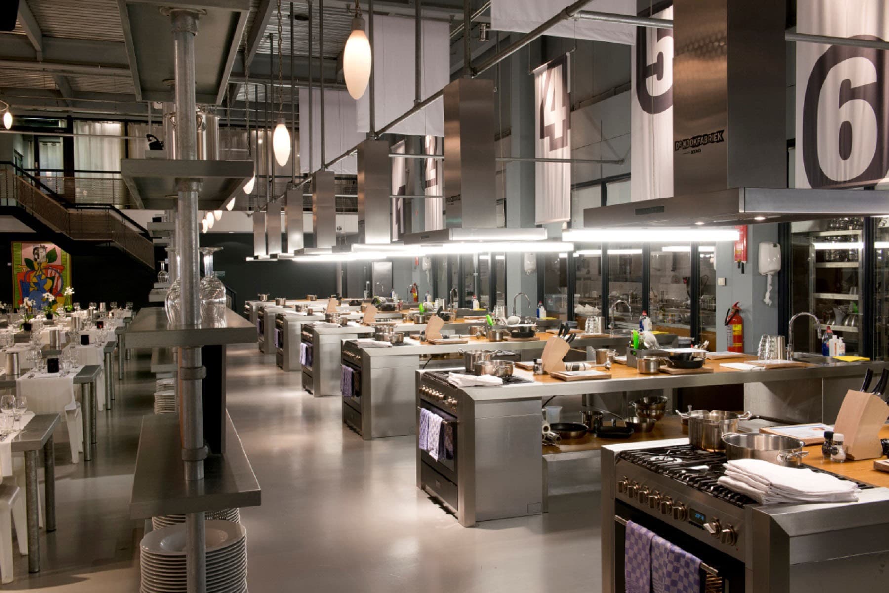 De Kookfabriek in Amsterdam is the ultimate location for an original and unforgettable group activity. The expansive cooking studio can accommodate large groups but is also ideal for intimate gatherings. De Kookfabriek is the place to learn, cook and taste, but it also offers sufficient space for business meetings or presentations. The open space can be divided into several rooms for smaller groups or simultaneous sessions.