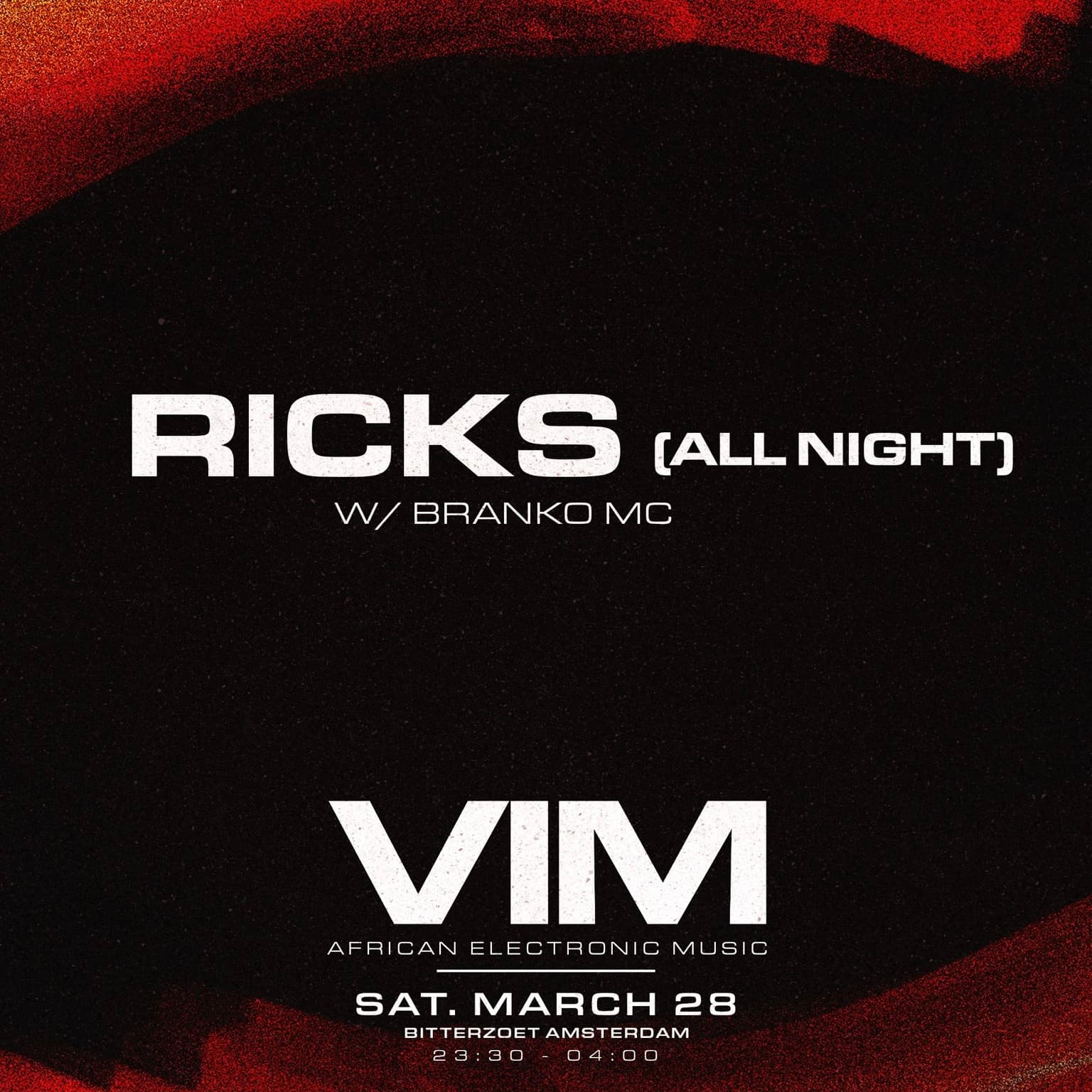 On Saturday, March 28, VIM presents Ricks All Nighter at Bitterzoet, Amsterdam. For the very first time, Rick will take over the night with an extended set, guiding the crowd deep into the early hours until 04:00 with the powerful, rhythmic sound he stands for: African Electronic Music.