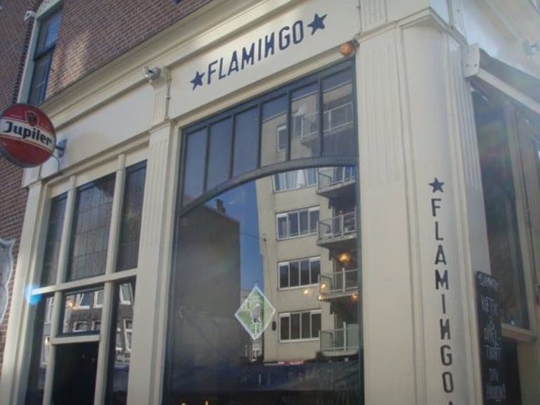 Midden op de Albert Cuypmarkt zit het moderne barretje Flamingo. Het mooie pandje met hoge etalageramen heeft een souterrain met hangbanken en ook een vide met tafels en stoelen staan. Pijpbewoners en marktbezoekers nemen daar plaats voor het nooit vervelende uitzicht over de markt. Het interieur is fris en vrij tijdloos met beige linnen tegen de muren, bruin hout en kitscherige kroonluchters. Flamingo is een echt drinkcafé met een ruime keuze aan bier en wijn en nauwelijks wat te eten.