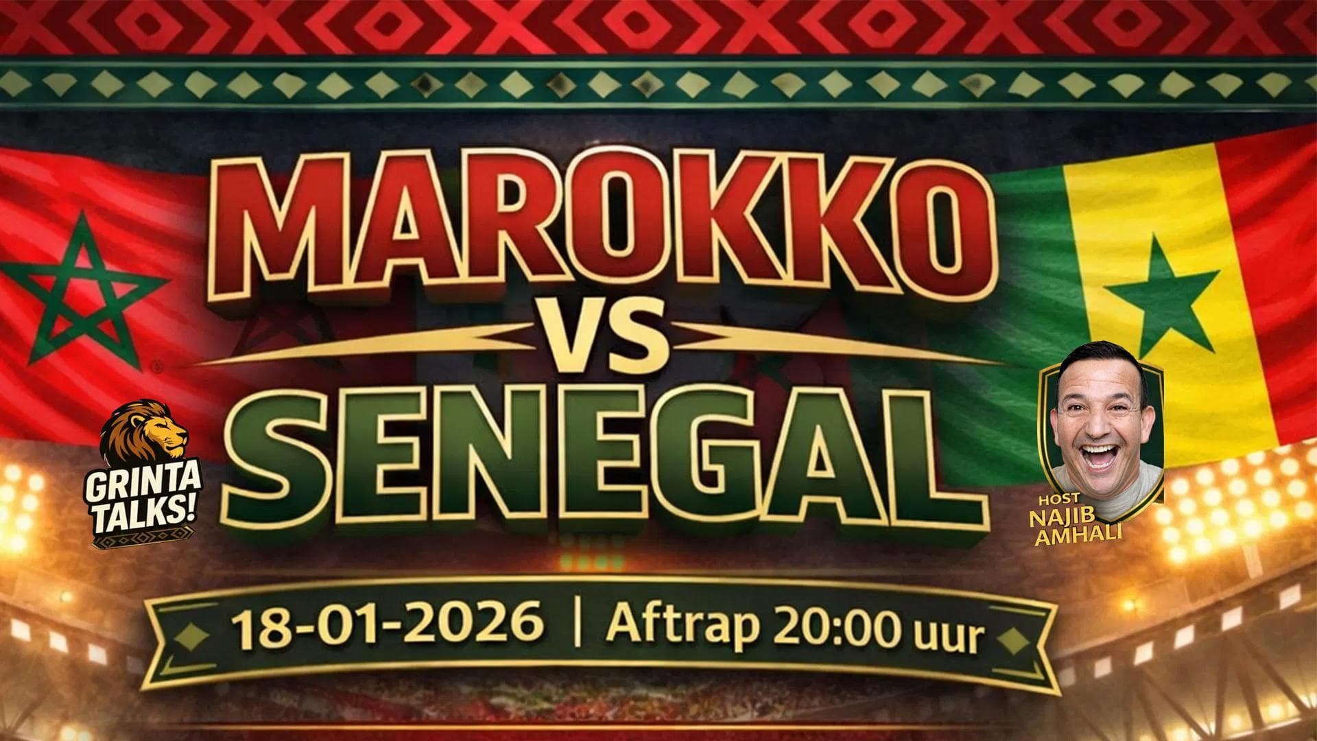 Najib Amhali, Grinta Talks! en Meervaart presenteren de finale van de 'Africa Cup of Nations 2026' tussen Senegal en Marokko! Voor Marokko is dit een historisch moment: het land staat voor het eerst sinds 2004 weer in de finale van de Afrika Cup en doet dat ditmaal als organiserend land.
