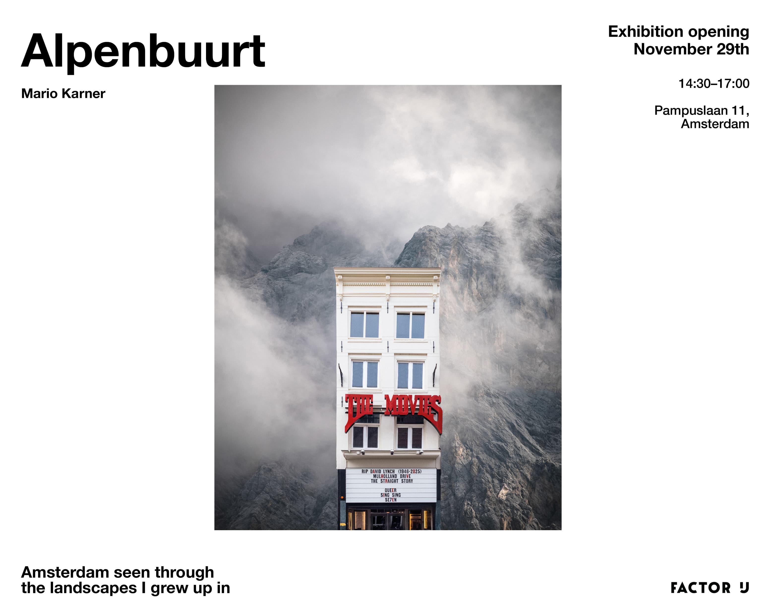 Alpenbuurt is een fotoserie van Mario Karner, te zien bij Factor IJ. De serie combineert Amsterdamse architectuur met berglandschappen uit zijn geboortestreek, volledig opgebouwd uit eigen foto's. Het werk nodigt bezoekers uit om te ontdekken hoe plaats, herinnering en verbondenheid in verschillende omgevingen kunnen samensmelten.