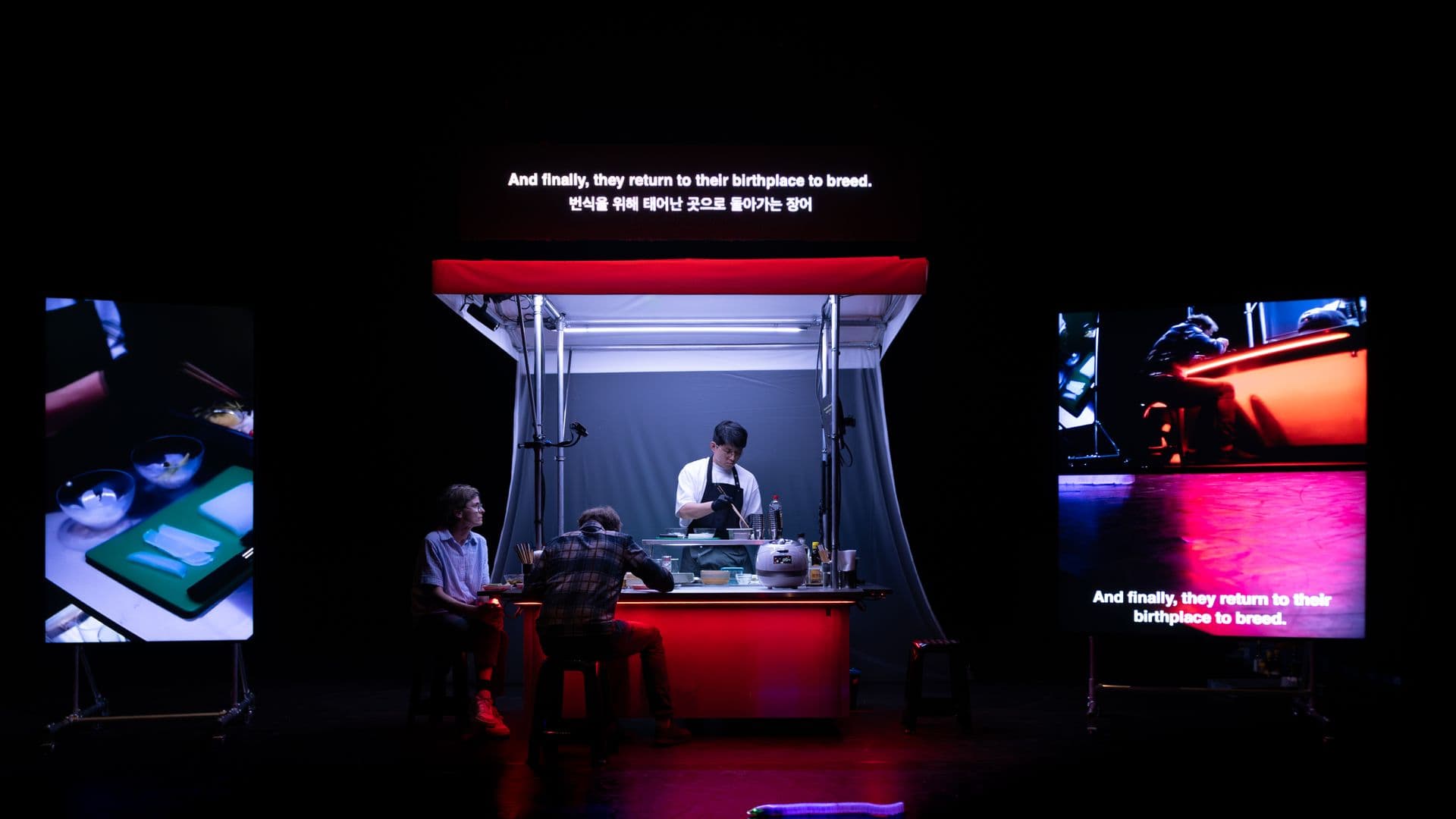 Via verschillende absurde en ontroerende anekdotes, neemt Jaha Koo ons mee op een culinaire reis, waarbij we de eetcultuur verkennen als een vorm van taal die de structuur van een samenleving onthult. De zwevende aroma's van een stomende, pruttelende soep, het scherpe geluid van een mes dat snel lente-uitjes snijdt, het gesis en geknetter van champignons op een gloeiend vuur. Deze voorstelling in theater Frascati is Koreaans gesproken met Nederlandse en Engelstalige boventiteling.